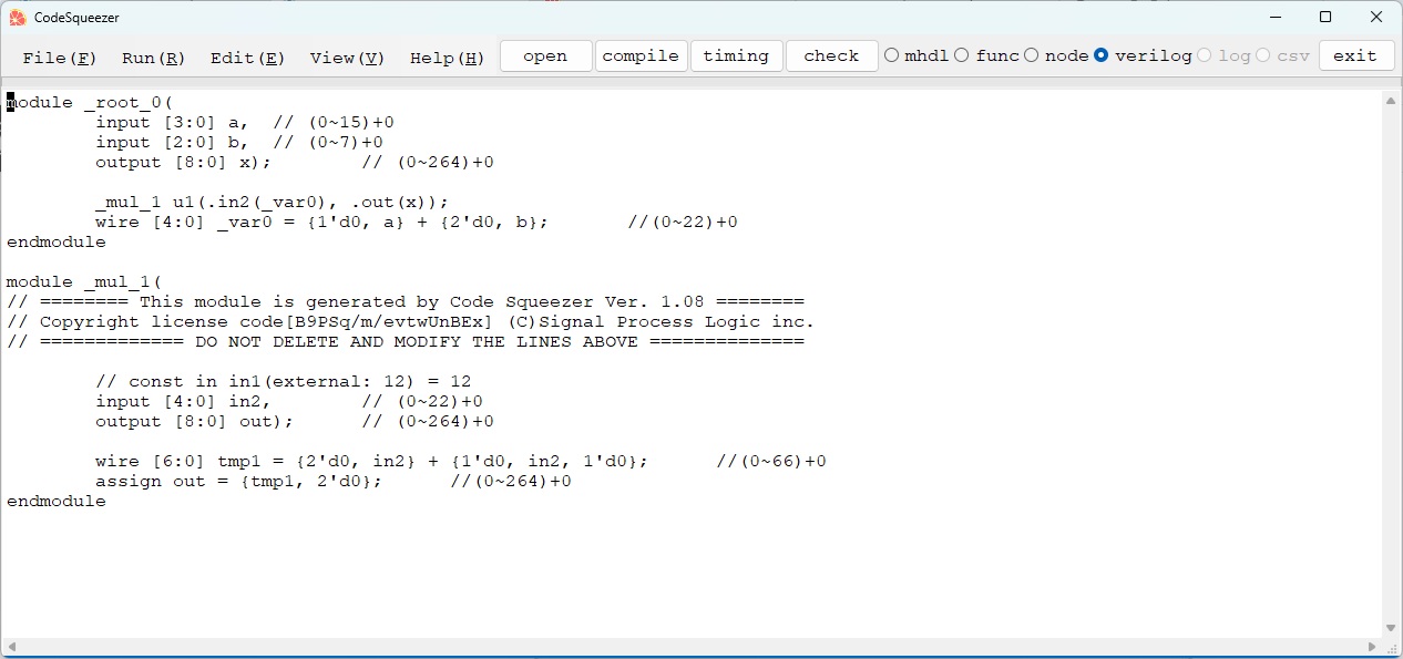 CodeSqueezerのその他の機能として、タイミング調整とシミュレータが含まれています。タイミング調整は、それぞれの論理ゲートの遅延を積算して、一定レベル以下に収まるようにレジスタを挿入して同期演算回路化するツールで、レジスタを経由することで発生するクロック遅延が、演算の複数入力間で同じになるように遅延用のレジスタを挿入しています。またシミュレータは、入力ポートの値の範囲指定を利用してテストベクターを自動発生し、これを順次入力したときの出力を画面表示し、またエクセルファイルの形で出力します。
