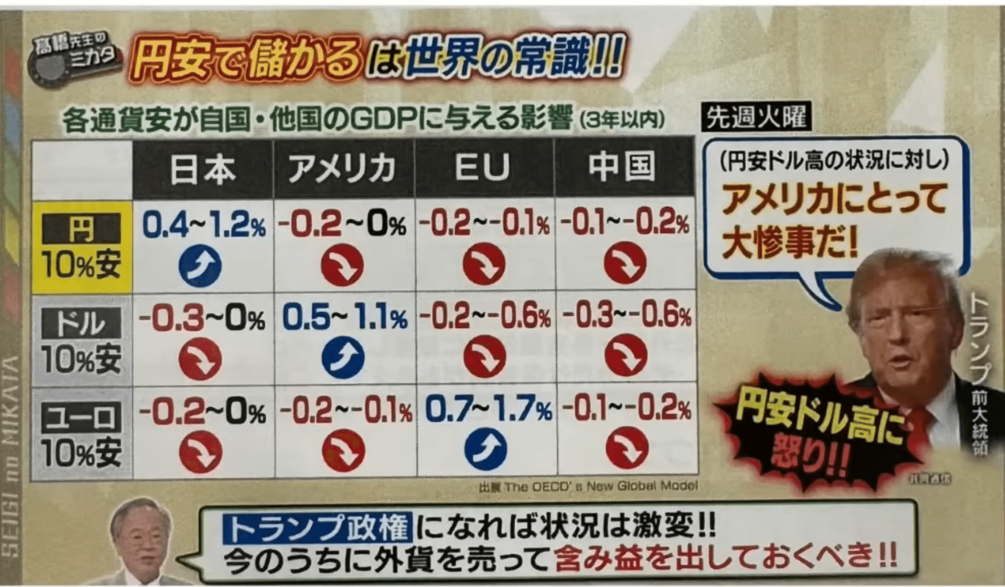 現実にトランプ氏が打った一手は関税の引き上げで、これも通貨安と同じ、貿易収支の黒字化効果があるのですが、普通にはこれもルール違反で、麻薬の輸入とか非関税障壁とか、いろいろな口実を探しているのが実情でしょう。