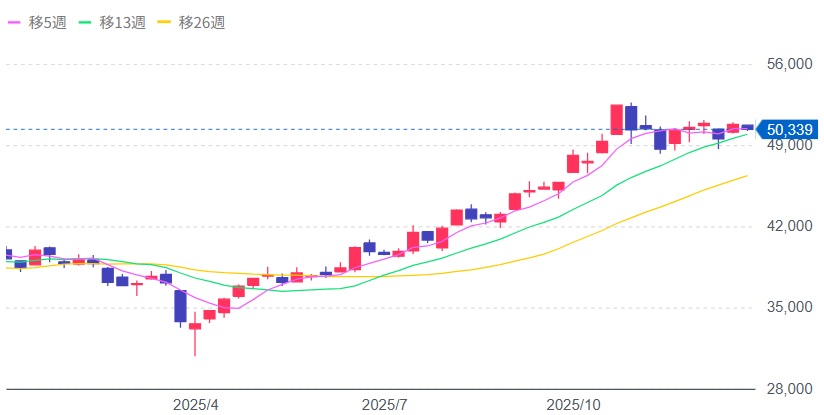 日経平均は、円安による企業収益の改善と、AIバブルの効果により大いに上昇し、11/4には52,636.87円の史上最高値を付けております。その後、ここからやや低いレベルでもみ合い状態となり、12/30の大納会は50,526.92円で引けております。
